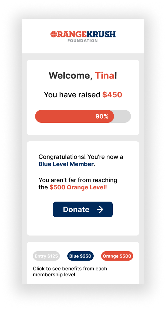 Sitting on top of the page, so upon login, the page would communicate quickly through this element about the fundraising progress and membership level.
